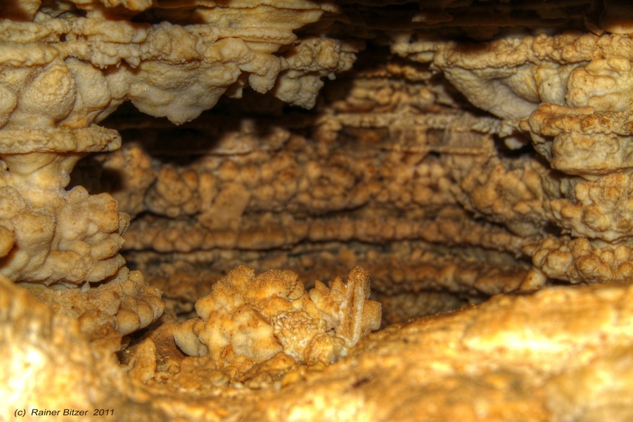 Es ist erstaunlich und erfreulich zu verfolgen, wie innerhalb von wenigen Jahrzehnten neue Sinterkalkschichten in leuchtenden Weiß- und Gelbtönen die alten Narben und Flecken überziehen!